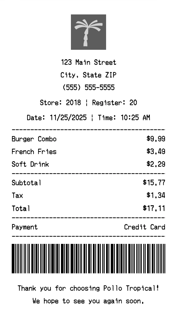 Create authentic Pollo Tropical receipts for fast casual purchases. Our free receipt generator tool helps you create professional, detailed receipts instantly. Perfect for business expense tracking, reimbursement requests, and personal documentation. Download high-quality PNG receipts in seconds, no signup required.