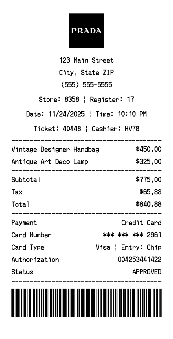 Our Prada receipt generator creates professional receipts that match the authentic Prada format. Each receipt includes the company logo, business information, transaction details, itemized purchase list, tax calculations, and payment information. All receipts are formatted to look exactly like real Prada receipts, making them perfect for expense reports, tax documentation, and reimbursement purposes.