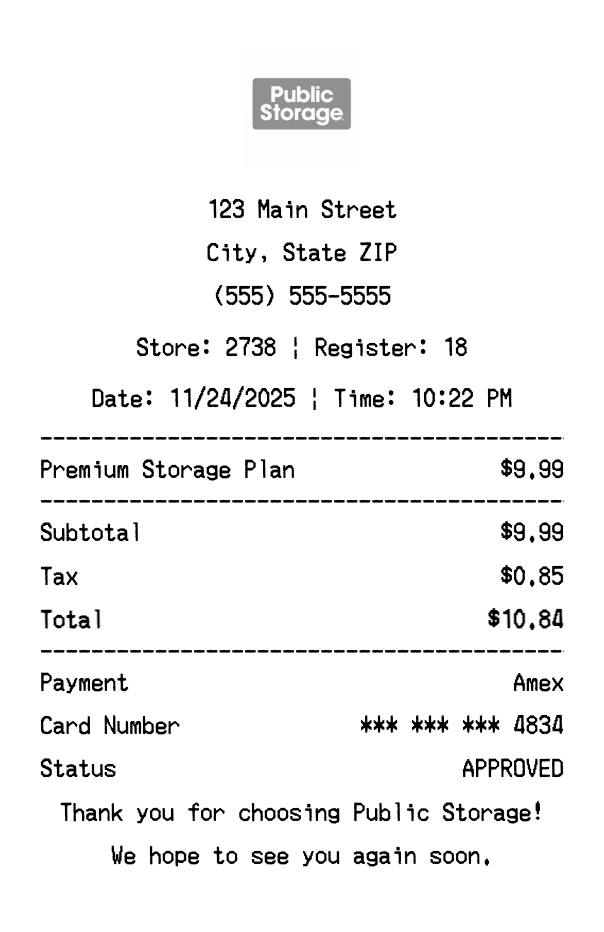 Create authentic Public Storage receipts instantly. Our free receipt generator produces professional storage receipts with company logo, itemized purchases, tax calculations, and payment details. Perfect for expense tracking, reimbursement, and documentation. Download high-quality PNG receipts in seconds.