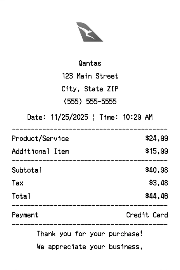 Create authentic Qantas receipts instantly. Our free receipt generator produces professional airlines receipts with company logo, itemized purchases, tax calculations, and payment details. Perfect for expense tracking, reimbursement, and documentation. Download high-quality PNG receipts in seconds.