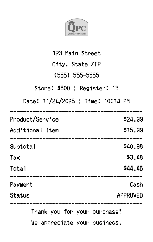 Our QFC receipt generator creates professional receipts that match the authentic QFC format. Each receipt includes the company logo, business information, transaction details, itemized purchase list, tax calculations, and payment information. All receipts are formatted to look exactly like real QFC receipts, making them perfect for expense reports, tax documentation, and reimbursement purposes.