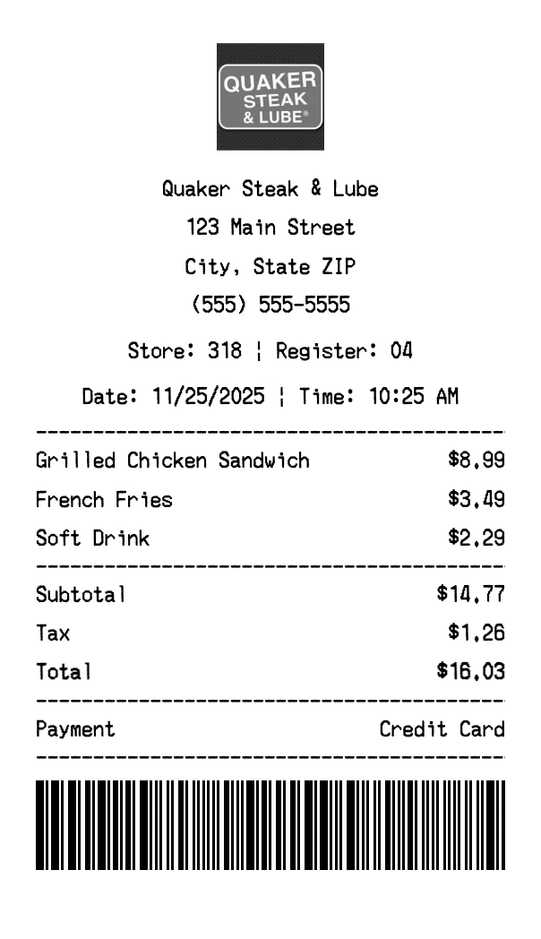 Create authentic Quaker Steak & Lube receipts for casual dining purchases. Our free receipt generator tool helps you create professional, detailed receipts instantly. Perfect for business expense tracking, reimbursement requests, and personal documentation. Download high-quality PNG receipts in seconds, no signup required.
