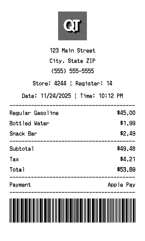 Create authentic QuikTrip receipts for convenience store purchases. Our free receipt generator tool helps you create professional, detailed receipts instantly. Perfect for business expense tracking, reimbursement requests, and personal documentation. Download high-quality PNG receipts in seconds, no signup required.