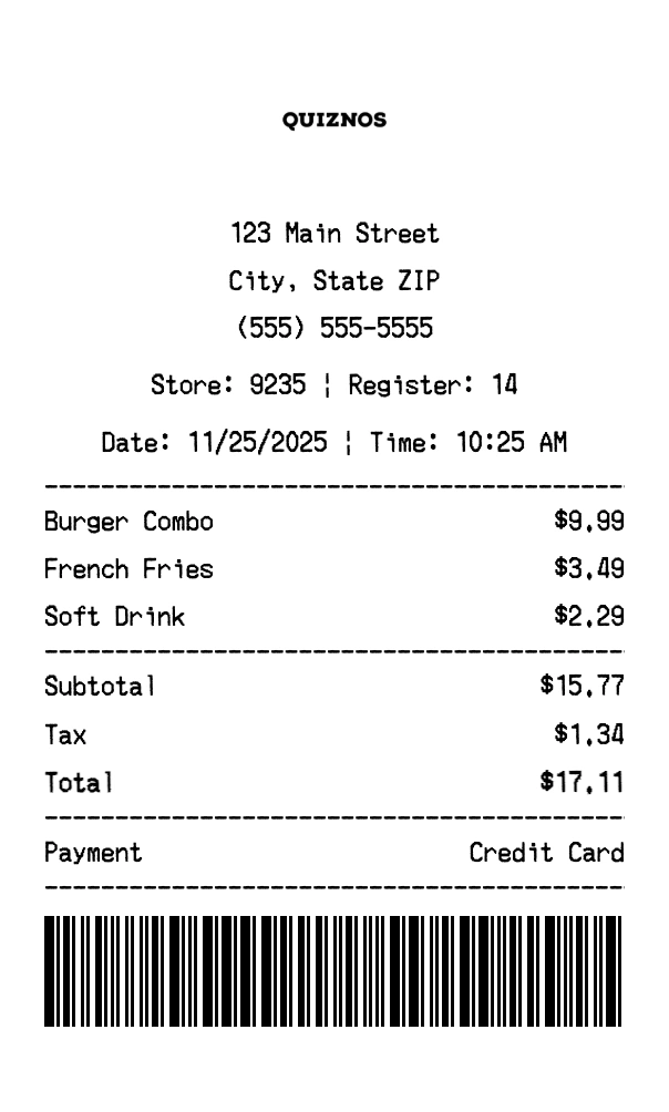 Create authentic Quiznos receipts for fast casual purchases. Our free receipt generator tool helps you create professional, detailed receipts instantly. Perfect for business expense tracking, reimbursement requests, and personal documentation. Download high-quality PNG receipts in seconds, no signup required.