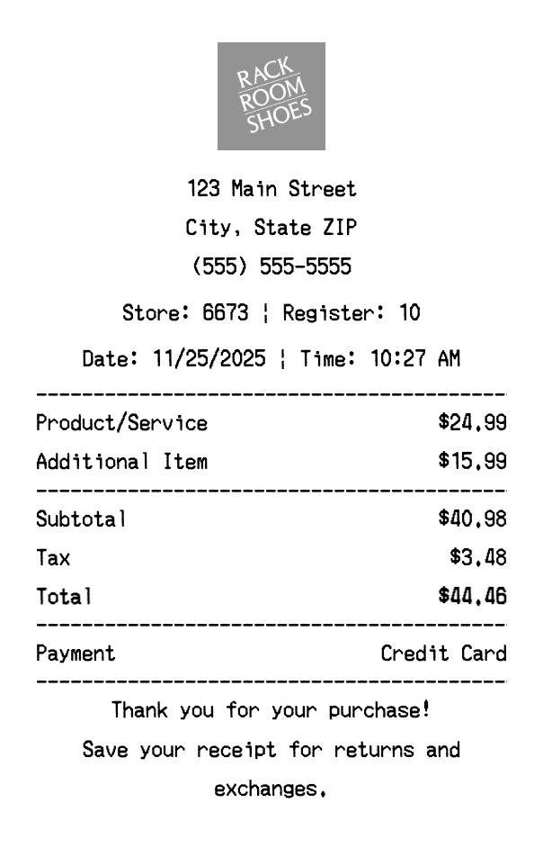 Create authentic Rack Room Shoes receipts for footwear purchases. Our free receipt generator tool helps you create professional, detailed receipts instantly. Perfect for business expense tracking, reimbursement requests, and personal documentation. Download high-quality PNG receipts in seconds, no signup required.