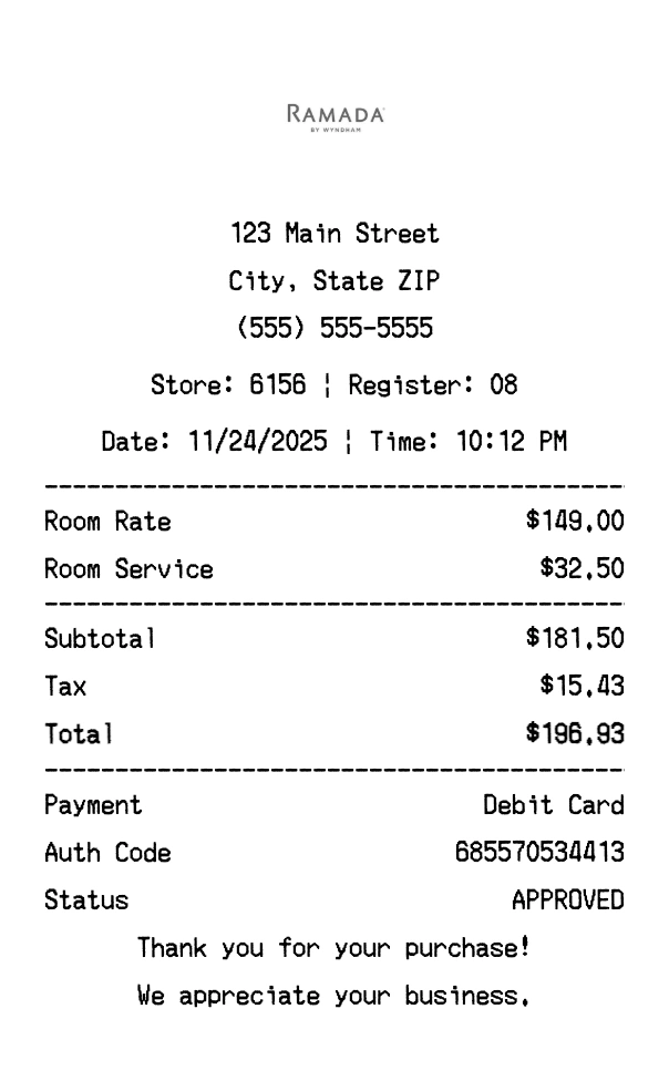 Create authentic Ramada receipts for hotel purchases. Our free receipt generator tool helps you create professional, detailed receipts instantly. Perfect for business expense tracking, reimbursement requests, and personal documentation. Download high-quality PNG receipts in seconds, no signup required.
