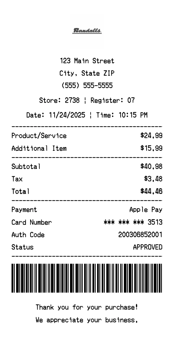 Our Randalls receipt generator creates professional receipts that match the authentic Randalls format. Each receipt includes the company logo, business information, transaction details, itemized purchase list, tax calculations, and payment information. All receipts are formatted to look exactly like real Randalls receipts, making them perfect for expense reports, tax documentation, and reimbursement purposes.