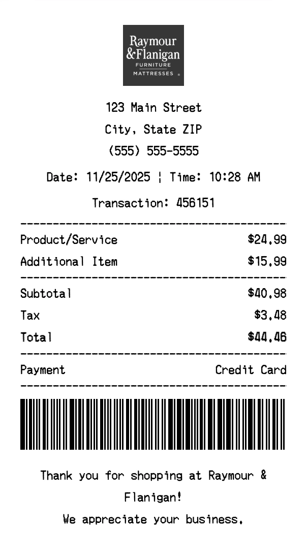 Create authentic Raymour & Flanigan receipts for furniture purchases. Our free receipt generator tool helps you create professional, detailed receipts instantly. Perfect for business expense tracking, reimbursement requests, and personal documentation. Download high-quality PNG receipts in seconds, no signup required.