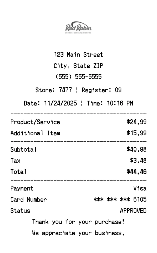Our Red Robin receipt generator creates professional receipts that match the authentic Red Robin format. Each receipt includes the company logo, business information, transaction details, itemized purchase list, tax calculations, and payment information. All receipts are formatted to look exactly like real Red Robin receipts, making them perfect for expense reports, tax documentation, and reimbursement purposes.