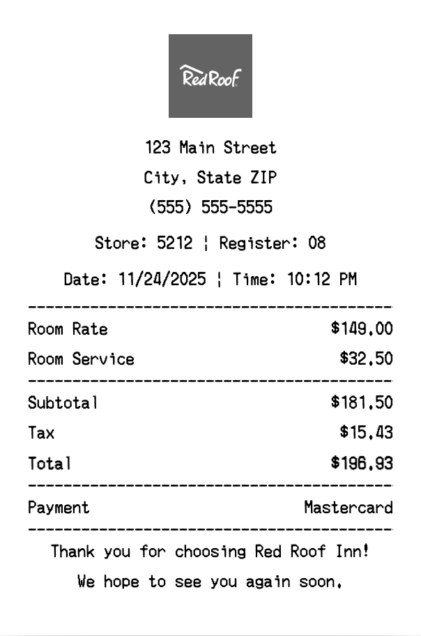 Create authentic Red Roof Inn receipts instantly. Our free receipt generator produces professional hotel receipts with company logo, itemized purchases, tax calculations, and payment details. Perfect for expense tracking, reimbursement, and documentation. Download high-quality PNG receipts in seconds.