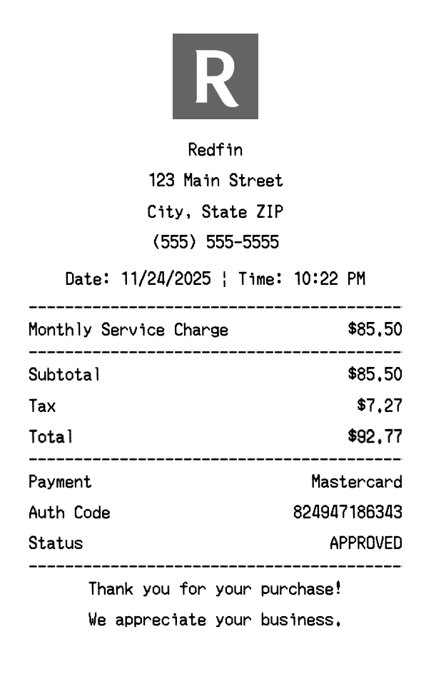 Create authentic Redfin receipts instantly. Our free receipt generator produces professional real estate receipts with company logo, itemized purchases, tax calculations, and payment details. Perfect for expense tracking, reimbursement, and documentation. Download high-quality PNG receipts in seconds.