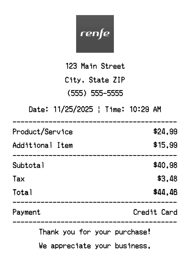 Create authentic Renfe receipts instantly. Our free receipt generator produces professional rail receipts with company logo, itemized purchases, tax calculations, and payment details. Perfect for expense tracking, reimbursement, and documentation. Download high-quality PNG receipts in seconds.