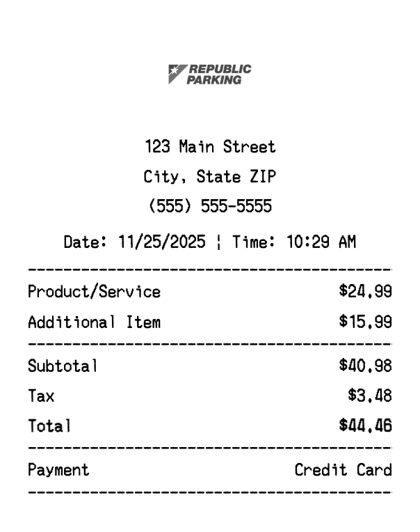 Create authentic Republic Parking receipts instantly. Our free receipt generator produces professional parking receipts with company logo, itemized purchases, tax calculations, and payment details. Perfect for expense tracking, reimbursement, and documentation. Download high-quality PNG receipts in seconds.