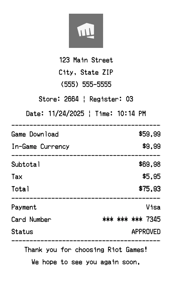 Create authentic Riot Games receipts for gaming purchases. Our free receipt generator tool helps you create professional, detailed receipts instantly. Perfect for business expense tracking, reimbursement requests, and personal documentation. Download high-quality PNG receipts in seconds, no signup required.