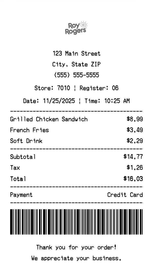 Create authentic Roy Rogers Restaurants receipts for fast food purchases. Our free receipt generator tool helps you create professional, detailed receipts instantly. Perfect for business expense tracking, reimbursement requests, and personal documentation. Download high-quality PNG receipts in seconds, no signup required.