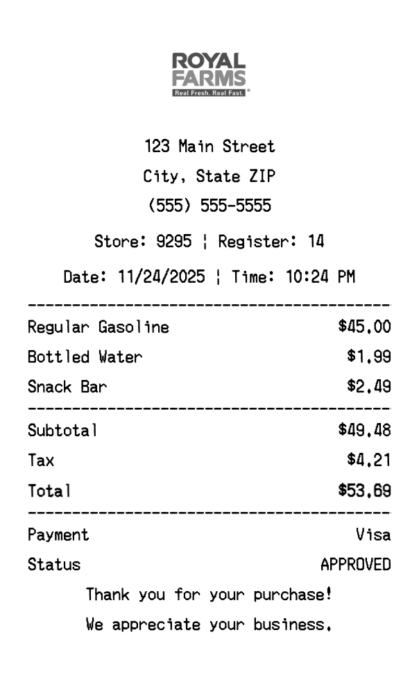 Create authentic Royal Farms receipts instantly. Our free receipt generator produces professional convenience store receipts with company logo, itemized purchases, tax calculations, and payment details. Perfect for expense tracking, reimbursement, and documentation. Download high-quality PNG receipts in seconds.