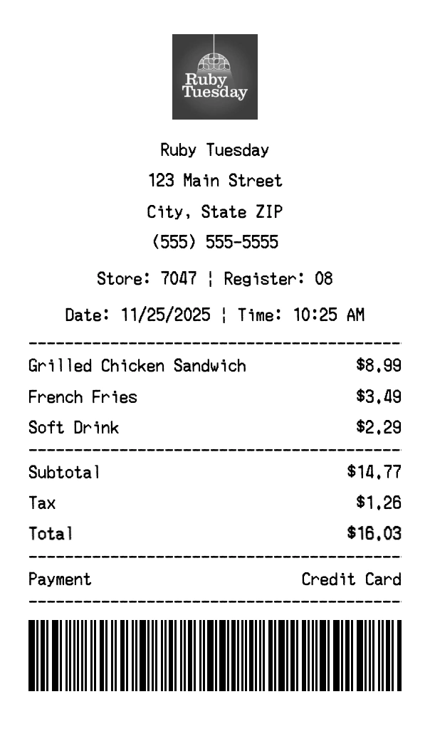 Create authentic Ruby Tuesday receipts for casual dining purchases. Our free receipt generator tool helps you create professional, detailed receipts instantly. Perfect for business expense tracking, reimbursement requests, and personal documentation. Download high-quality PNG receipts in seconds, no signup required.