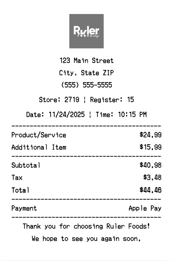 Create authentic Ruler Foods receipts instantly. Our free receipt generator produces professional grocery store receipts with company logo, itemized purchases, tax calculations, and payment details. Perfect for expense tracking, reimbursement, and documentation. Download high-quality PNG receipts in seconds.