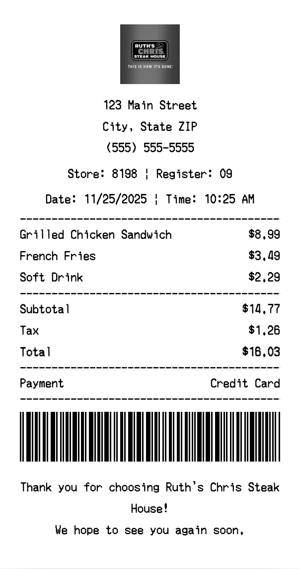 Create authentic Ruth's Chris Steak House receipts for fine dining purchases. Our free receipt generator tool helps you create professional, detailed receipts instantly. Perfect for business expense tracking, reimbursement requests, and personal documentation. Download high-quality PNG receipts in seconds, no signup required.