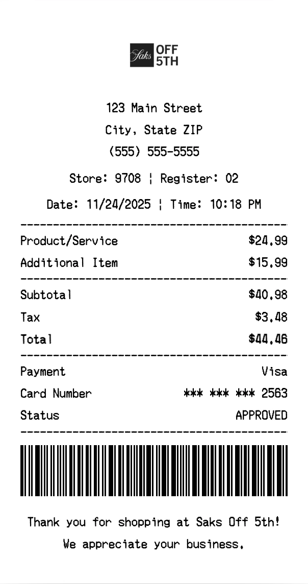 Create authentic Saks Off 5th receipts for discount retail purchases. Our free receipt generator tool helps you create professional, detailed receipts instantly. Perfect for business expense tracking, reimbursement requests, and personal documentation. Download high-quality PNG receipts in seconds, no signup required.