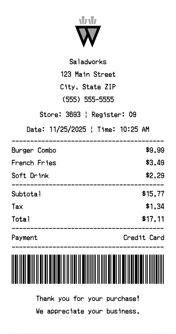 Create authentic Saladworks receipts instantly. Our free receipt generator produces professional fast casual receipts with company logo, itemized purchases, tax calculations, and payment details. Perfect for expense tracking, reimbursement, and documentation. Download high-quality PNG receipts in seconds.