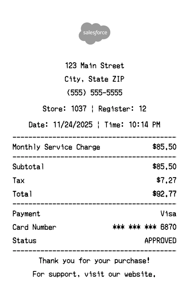 Create authentic Salesforce receipts instantly. Our free receipt generator produces professional software receipts with company logo, itemized purchases, tax calculations, and payment details. Perfect for expense tracking, reimbursement, and documentation. Download high-quality PNG receipts in seconds.