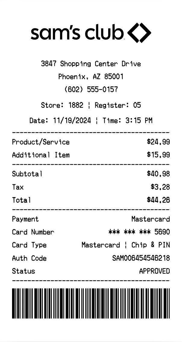 Create authentic Sam's Club receipts for warehouse retail purchases. Our free receipt generator tool helps you create professional, detailed receipts instantly. Perfect for business expense tracking, reimbursement requests, and personal documentation. Download high-quality PNG receipts in seconds, no signup required.