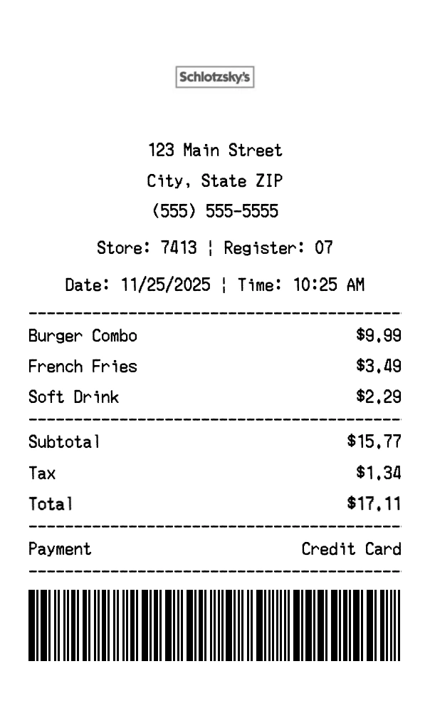 Create authentic Schlotzsky's receipts instantly. Our free receipt generator produces professional fast casual receipts with company logo, itemized purchases, tax calculations, and payment details. Perfect for expense tracking, reimbursement, and documentation. Download high-quality PNG receipts in seconds.
