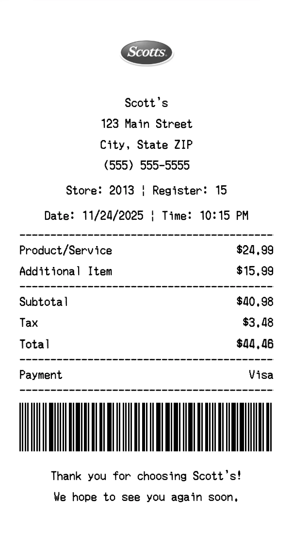 Create authentic Scott's receipts instantly. Our free receipt generator produces professional grocery store receipts with company logo, itemized purchases, tax calculations, and payment details. Perfect for expense tracking, reimbursement, and documentation. Download high-quality PNG receipts in seconds.