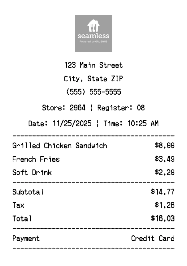 Our Seamless receipt generator creates professional receipts that match the authentic Seamless format. Each receipt includes the company logo, business information, transaction details, itemized purchase list, tax calculations, and payment information. All receipts are formatted to look exactly like real Seamless receipts, making them perfect for expense reports, tax documentation, and reimbursement purposes.