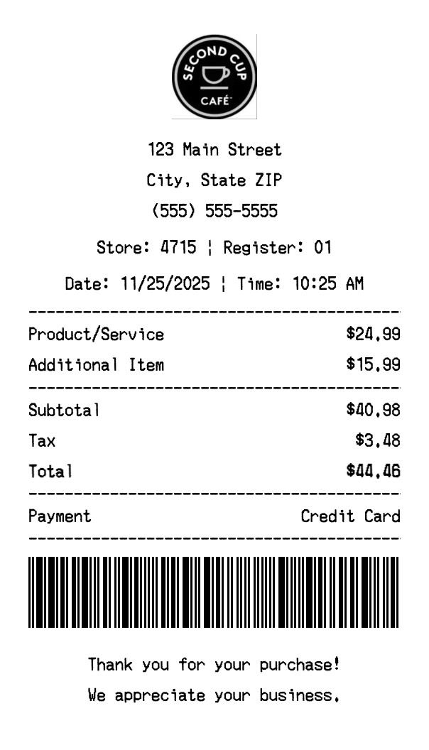 Create authentic Second Cup receipts instantly. Our free receipt generator produces professional coffee receipts with company logo, itemized purchases, tax calculations, and payment details. Perfect for expense tracking, reimbursement, and documentation. Download high-quality PNG receipts in seconds.