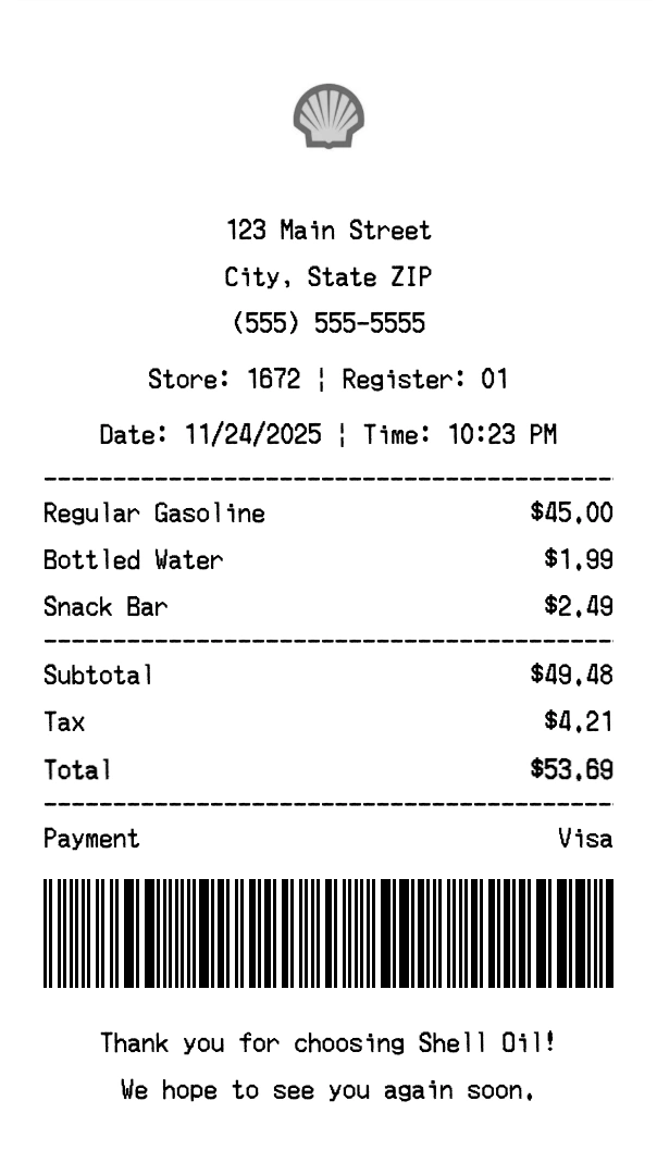 Create authentic Shell Oil receipts for gas station purchases. Our free receipt generator tool helps you create professional, detailed receipts instantly. Perfect for business expense tracking, reimbursement requests, and personal documentation. Download high-quality PNG receipts in seconds, no signup required.