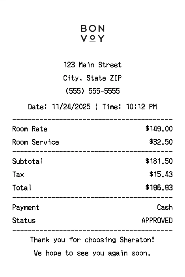 Create authentic Sheraton receipts instantly. Our free receipt generator produces professional hotel receipts with company logo, itemized purchases, tax calculations, and payment details. Perfect for expense tracking, reimbursement, and documentation. Download high-quality PNG receipts in seconds.