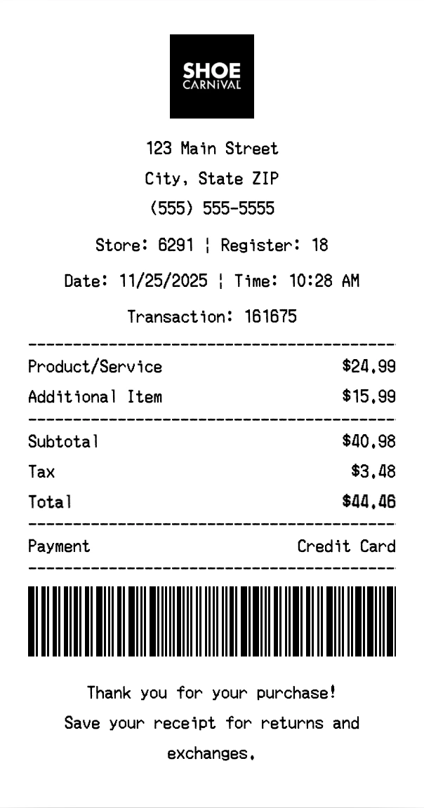 Our Shoe Carnival receipt generator creates professional receipts that match the authentic Shoe Carnival format. Each receipt includes the company logo, business information, transaction details, itemized purchase list, tax calculations, and payment information. All receipts are formatted to look exactly like real Shoe Carnival receipts, making them perfect for expense reports, tax documentation, and reimbursement purposes.