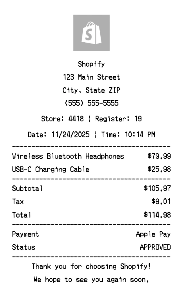 Create authentic Shopify receipts instantly. Our free receipt generator produces professional e-commerce platform receipts with company logo, itemized purchases, tax calculations, and payment details. Perfect for expense tracking, reimbursement, and documentation. Download high-quality PNG receipts in seconds.
