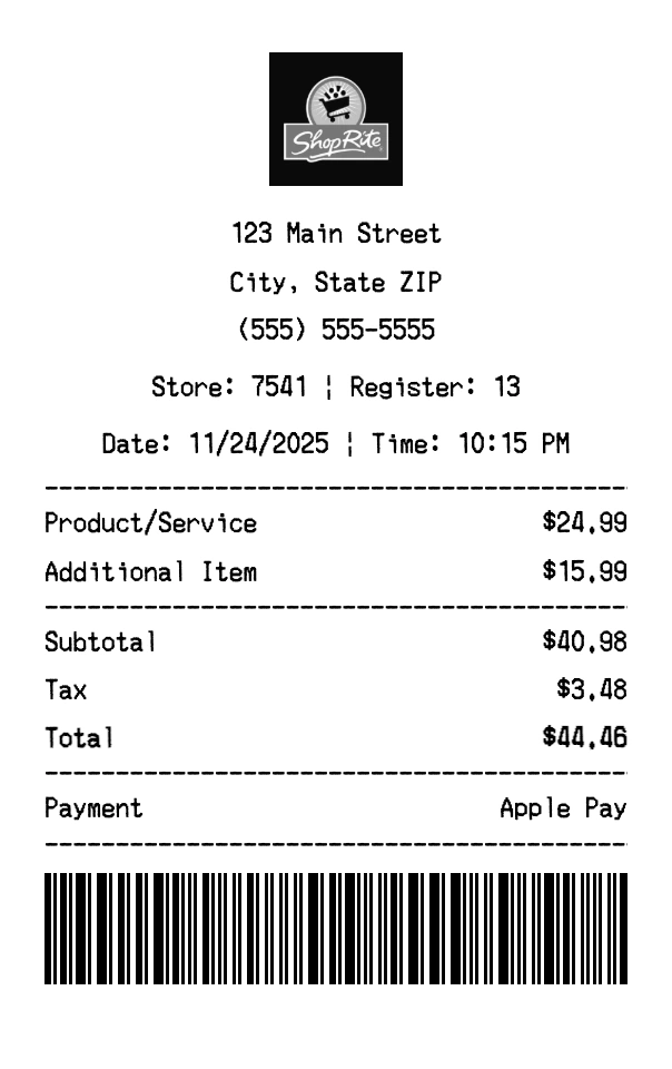 Create authentic ShopRite receipts for grocery store purchases. Our free receipt generator tool helps you create professional, detailed receipts instantly. Perfect for business expense tracking, reimbursement requests, and personal documentation. Download high-quality PNG receipts in seconds, no signup required.