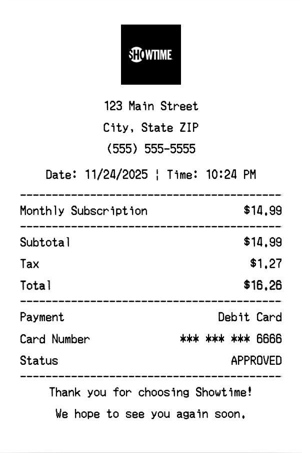 Create authentic Showtime receipts for streaming purchases. Our free receipt generator tool helps you create professional, detailed receipts instantly. Perfect for business expense tracking, reimbursement requests, and personal documentation. Download high-quality PNG receipts in seconds, no signup required.