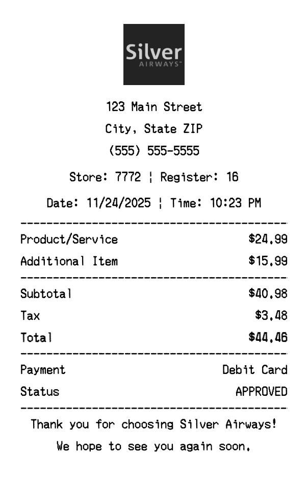 Create authentic Silver Airways receipts instantly. Our free receipt generator produces professional airline receipts with company logo, itemized purchases, tax calculations, and payment details. Perfect for expense tracking, reimbursement, and documentation. Download high-quality PNG receipts in seconds.