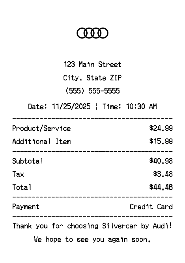 Create authentic Silvercar by Audi receipts instantly. Our free receipt generator produces professional car rental receipts with company logo, itemized purchases, tax calculations, and payment details. Perfect for expense tracking, reimbursement, and documentation. Download high-quality PNG receipts in seconds.