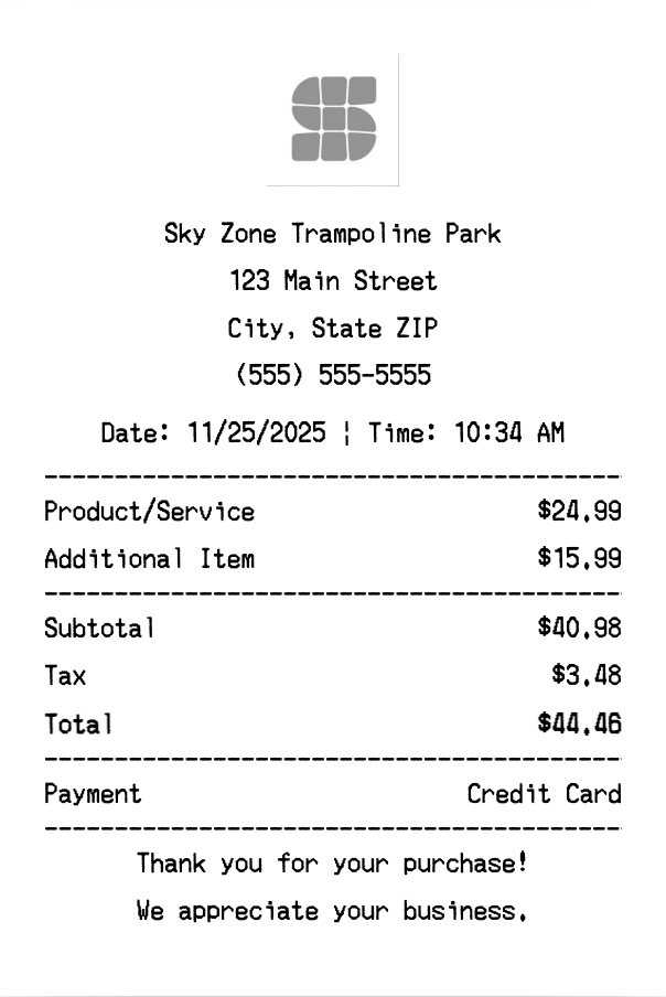 Create authentic Sky Zone Trampoline Park receipts for entertainment purchases. Our free receipt generator tool helps you create professional, detailed receipts instantly. Perfect for business expense tracking, reimbursement requests, and personal documentation. Download high-quality PNG receipts in seconds, no signup required.