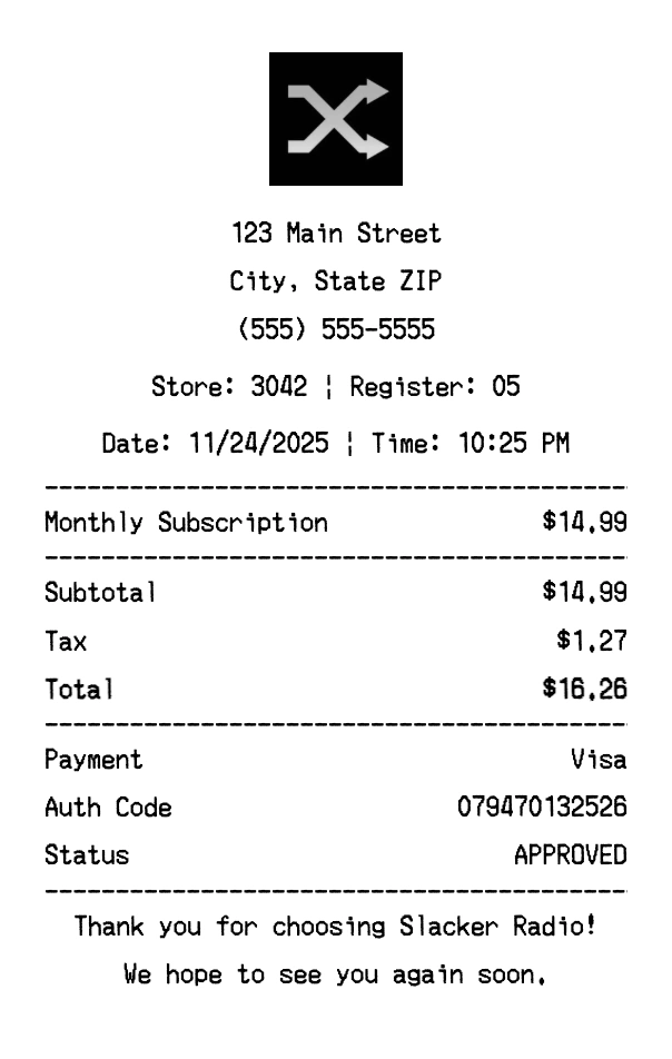 Create authentic Slacker Radio receipts instantly. Our free receipt generator produces professional music streaming receipts with company logo, itemized purchases, tax calculations, and payment details. Perfect for expense tracking, reimbursement, and documentation. Download high-quality PNG receipts in seconds.