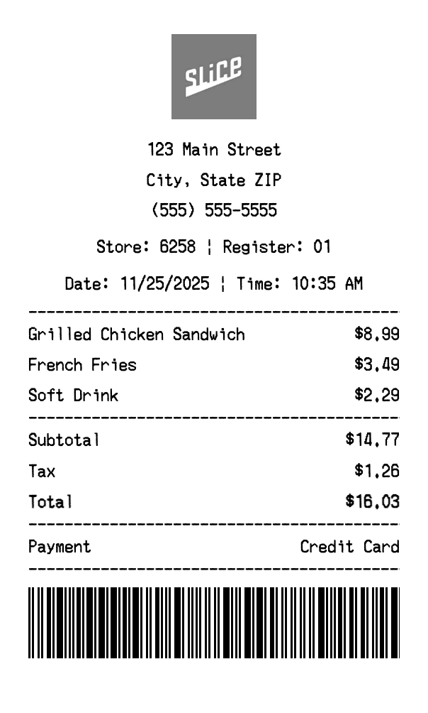 Create authentic Slice Pizza App receipts instantly. Our free receipt generator produces professional food delivery receipts with company logo, itemized purchases, tax calculations, and payment details. Perfect for expense tracking, reimbursement, and documentation. Download high-quality PNG receipts in seconds.