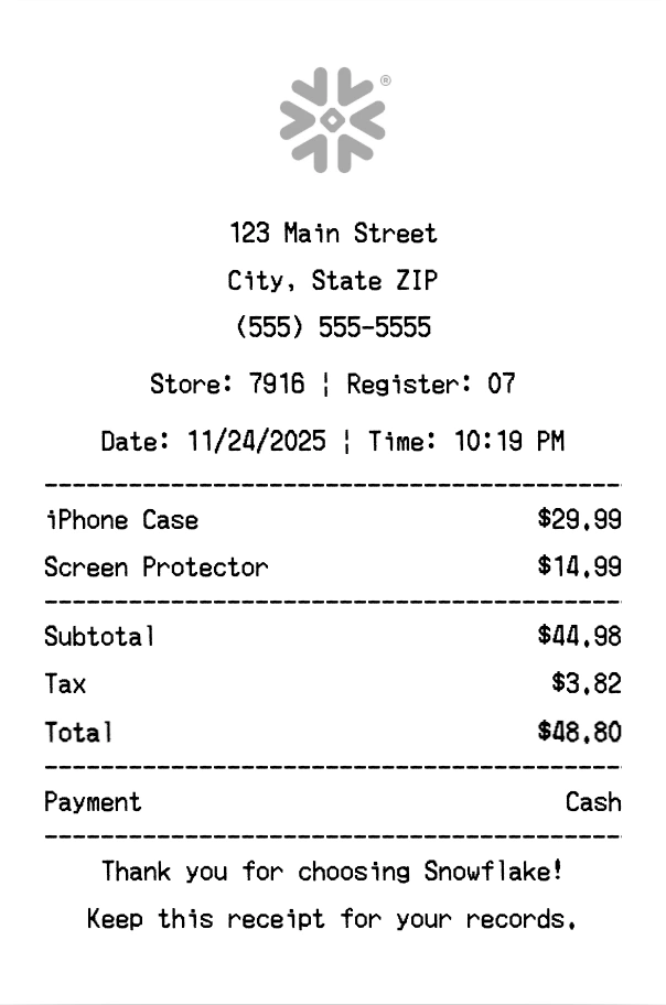 Create authentic Snowflake receipts instantly. Our free receipt generator produces professional technology receipts with company logo, itemized purchases, tax calculations, and payment details. Perfect for expense tracking, reimbursement, and documentation. Download high-quality PNG receipts in seconds.