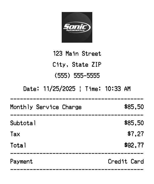 Create authentic Sonic Automotive receipts instantly. Our free receipt generator produces professional car dealer receipts with company logo, itemized purchases, tax calculations, and payment details. Perfect for expense tracking, reimbursement, and documentation. Download high-quality PNG receipts in seconds.