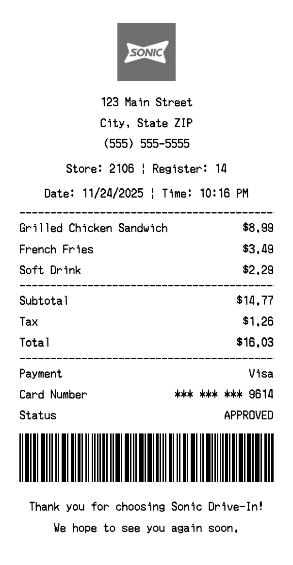Create authentic Sonic Drive-In receipts for fast food purchases. Our free receipt generator tool helps you create professional, detailed receipts instantly. Perfect for business expense tracking, reimbursement requests, and personal documentation. Download high-quality PNG receipts in seconds, no signup required.