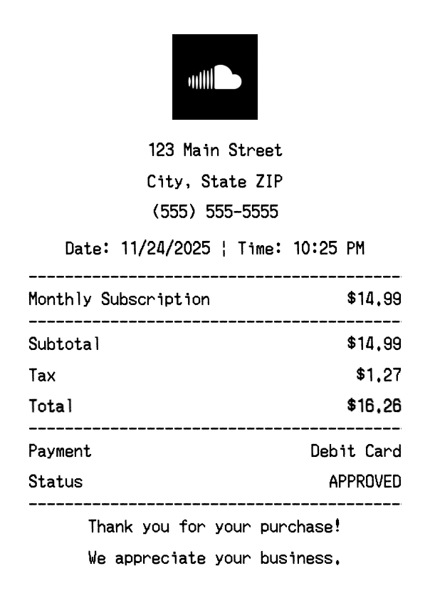 Create authentic SoundCloud receipts instantly. Our free receipt generator produces professional music streaming receipts with company logo, itemized purchases, tax calculations, and payment details. Perfect for expense tracking, reimbursement, and documentation. Download high-quality PNG receipts in seconds.