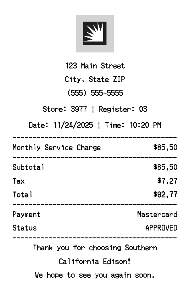 Create authentic Southern California Edison receipts instantly. Our free receipt generator produces professional energy receipts with company logo, itemized purchases, tax calculations, and payment details. Perfect for expense tracking, reimbursement, and documentation. Download high-quality PNG receipts in seconds.
