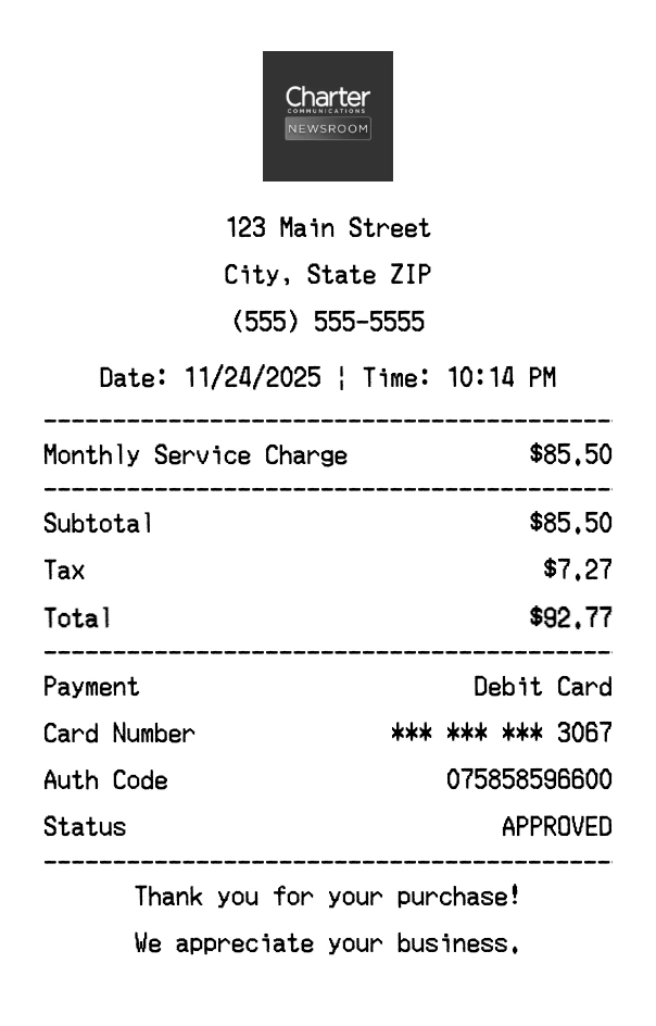 Create authentic Spectrum receipts instantly. Our free receipt generator produces professional internet & tv receipts with company logo, itemized purchases, tax calculations, and payment details. Perfect for expense tracking, reimbursement, and documentation. Download high-quality PNG receipts in seconds.