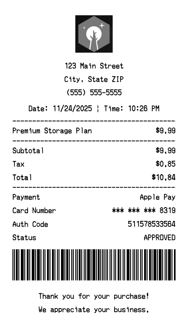 What format are the receipts? Receipts are generated as high-quality PNG images that you can download instantly and use for any documentation needs.