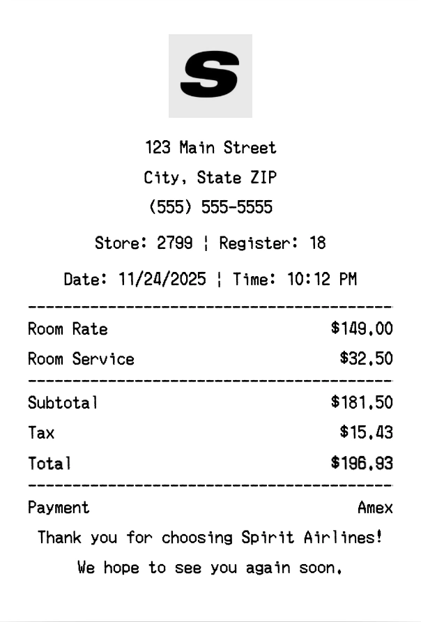 Create authentic Spirit Airlines receipts for airline purchases. Our free receipt generator tool helps you create professional, detailed receipts instantly. Perfect for business expense tracking, reimbursement requests, and personal documentation. Download high-quality PNG receipts in seconds, no signup required.